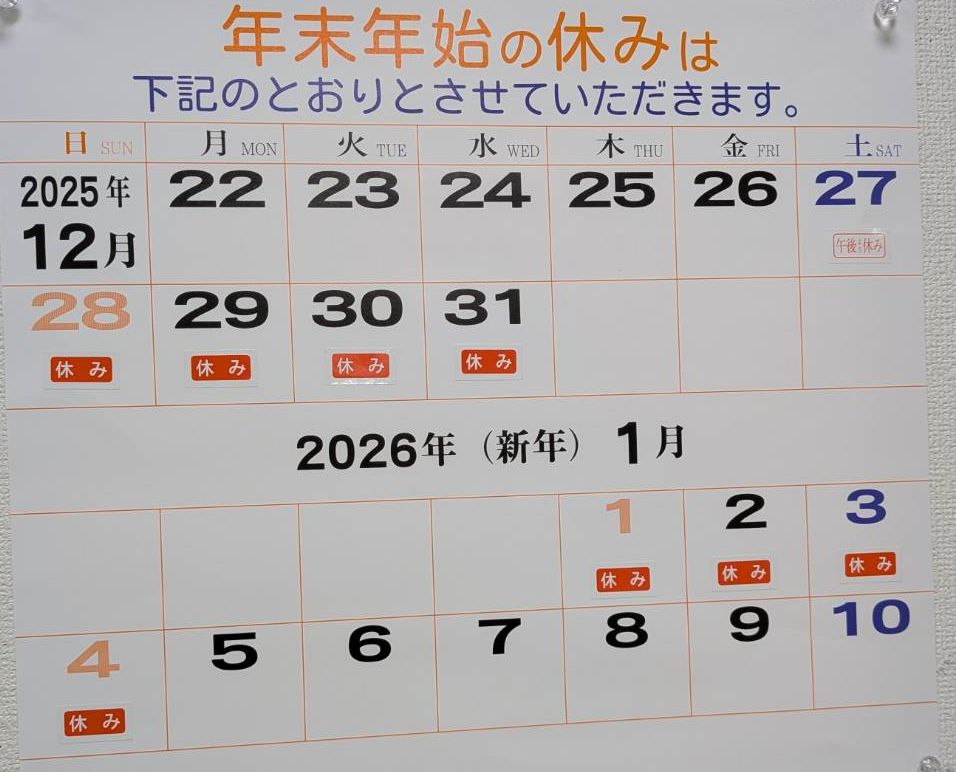 年末年始 2025(令和7)年12月28日(日)~2026(令和8)年1月4日(日)